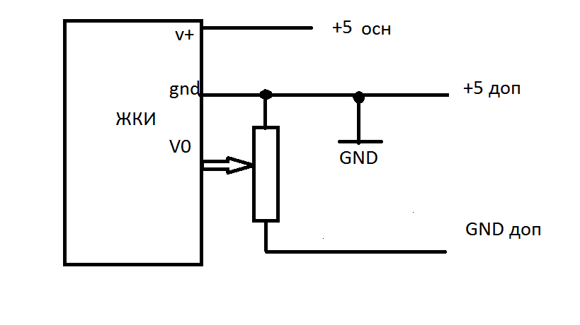 По схеме "Или так" я уже спаял, она неработает. В протусе программа рисует черную строку на экране но в реальной схеме ничего непроисходит. Я выпаял из схемы вывод V0 и припоял его к резистору на 10к который подключон одной нагой к ( gnd доп.) а второй (+5 доп и GND осн.) и толко так экран чернеет в зависимости от положения резистора. Но чернеет экран не так как я запрогромировал (со всякими багами и какимито глюками, неописать, их надо видеть  ) возможно глюки изза того что питанее не двуполярное по сути всеголиш два стабилезатора по 5 воль включонные последоательно (двуполярного источника у меня нет)