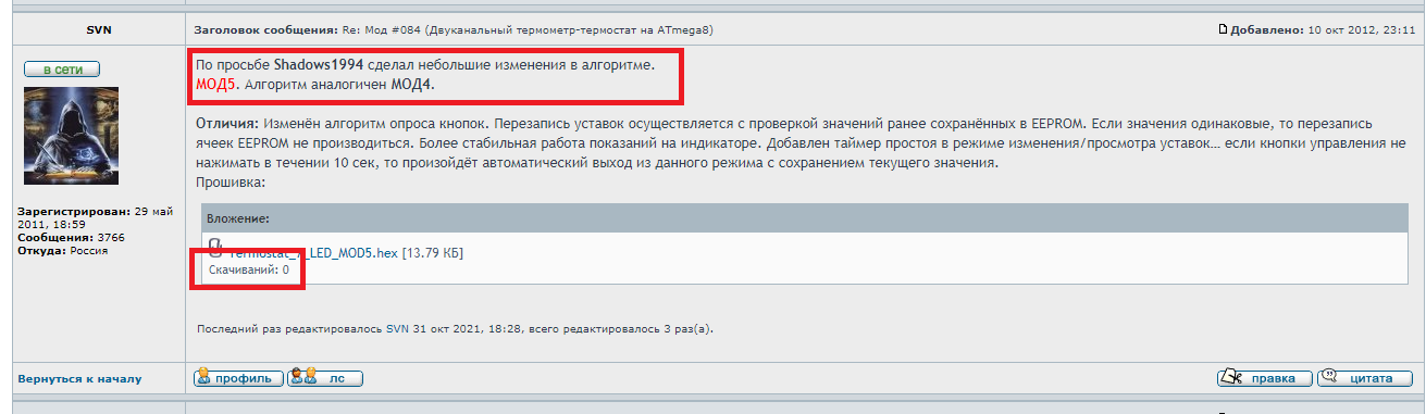 [quote="Shadows1994"]Добрый день. именно эта прошивка, на которую ссылку мне кинули и стоит. но сам из настроек он не выходит( кнопки подключил вроде как надо. даже подтягивающий резистор к плюсу поставил. но все равно такая байда. могли бы вы добавить принудительный выход из меню настройки, скажем через 30 сек. не в зависимости от активности кнопок?. ну или не 30 сек а 60. мне бы это помогло.[/quote] Вы невнимательны. Я Вам дал ссылку непосредственно на тот пост где вчера оставил новую прошивку под названием [b][color=#FF0000]МОД5[/color][/b]. Но по какой-то причине, Вы акцентировали внимание на нижнем посте, где прошивка МОД4. Мой же новый пост находится над постом с МОД4. Вот та повторная ссылка: [url]http://www.forum.getchip.net/viewtopic.php?p=3459#p3459[/url] Вот как выглядит тот пост: [attachment=0]1.png[/attachment]
