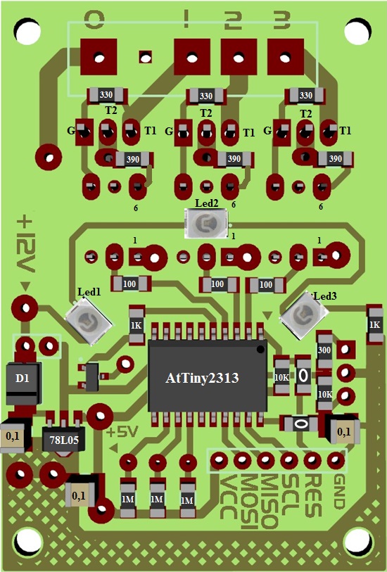 Добрый день всем участникам этого форума и конечно Большое спасибо Автору за этот прекрасный проект!!! Уже прошло 3 года с тех пор как я собрал для квартиры эту схему. Оно прекрасно работает. Есть одна маленькая проблема.. При включение холодильника Свет где использованы эти сенсорные выключатели промигивают. То есть помеха запуска двигателя холодильника каким то образом проникает в эту схему.. На плате сенсорных выключателей по питанию до и после стабилизатора 78L05 конденсаторы стоят. Рисунки платы выставляю. Вот хочу спросить тут у вас и у автора- чем можно побороть эту проблему?