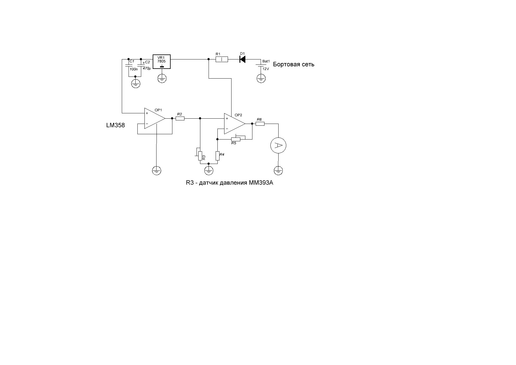 Брат купил на машину чудо китайской мысли - измеритель давления. Начали ставить на машину - при подаче питания стрелка зашкаливает. Видимо он под другой датчик. Инструкция на китайском. Понять не возможно. Знакомого китайца нет. Разобрал,внутри оказалась вот такая схема. Подключил вместо датчика давления магазин сопротивлений - действительно,работает наоборот, при увеличении сопротивления показания увеличиваются. А у ММ393А при 0 кгс/см^2 - 315 Ом, при 8 кгс/см^2 - 10 Ом (беру средние значения). Вопроса собственно два:
