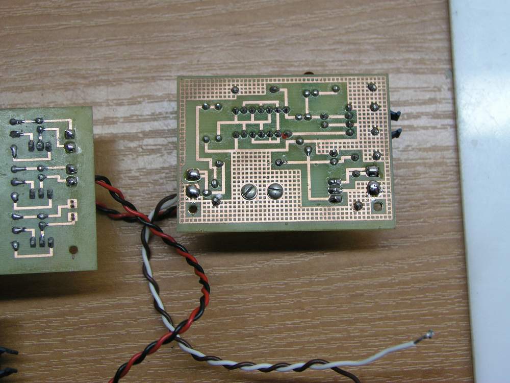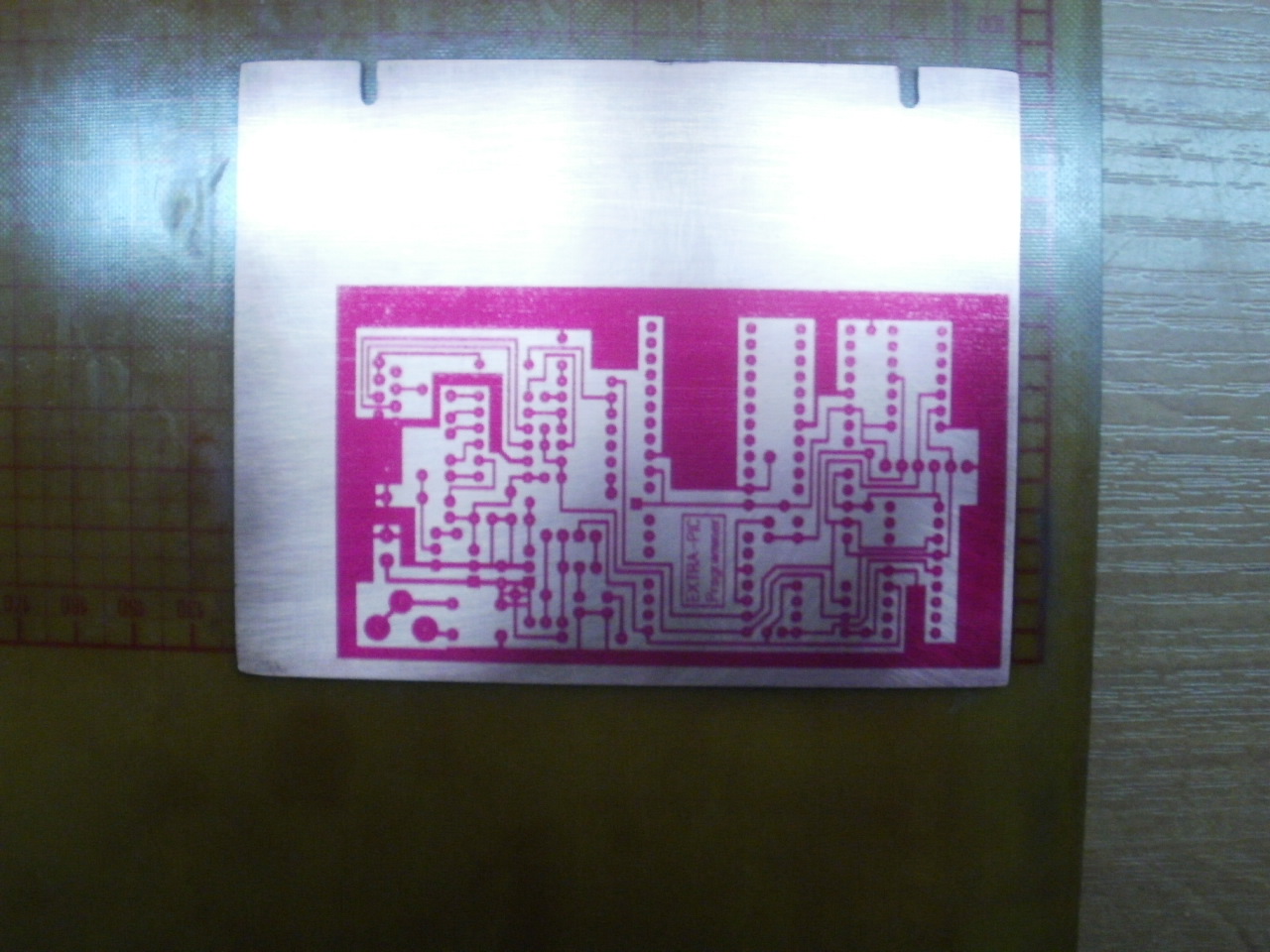 Плату сверлил и паял мой семилетний сын. Плату потом протер спиртом с канифолью. Непропай потому что панельки выпаивались газовой горелкой с плат , плата горела и поэтому налет на выводах черный только на кончиках , а ниже они луженные . Я всегда счищаю этот налет , но эта плата делалась просто ради интереса , уже у меня есть программатор «экстра пик». У меня есть станок для рисования печатных плат , полностью моя программа , моя разработка станка . Я его описывал раньше на форумах « станок для рисования печатных плат и выжигания лазером » , кому интересно погуглите , только вот не на всех форумах фотки остались . P2010055.JPG