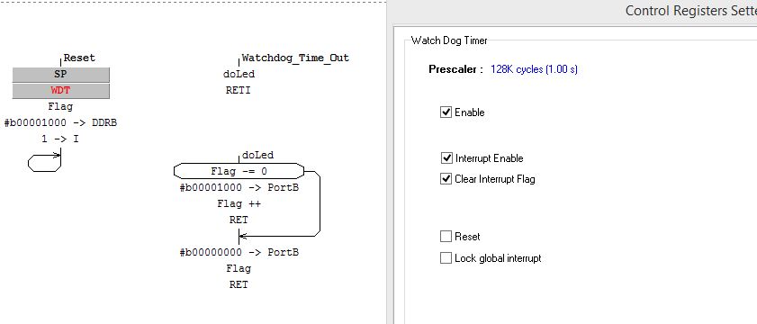http://www.getchip.net/posts/105-kontro ... -lestnicy/ ). Во первых он базируеться на Тини2313 (в корпусе SOIC легче паять чем Мегу88), во вторых у него только 2 датчика (для упрощения разварачивания всей конструкции и написания программы). Тоесть он "более тупой", чем конструкция из блога, и предназначен для незаргуженных трафиком лесниц (например на мансардный этаж, или типа того). Ступени подключены к Портам B и D. Датчики к Порту А. В качестве датчиков, я пока (на этапе тестирования на макетке) использую обычные тактовые кнопки с подтяжкой к плюсу питания и прижатием к земле при нажатии. В будущем предусматриваеться использование только цифровых датчиков, так как у Тини2313 нет аналоговых пинов. Датчик освещения планирую прикрепить к выводу ресет, тогда при достаточном уровне освещенности он будет прижимать ресет к земле, и контроллер будет в постоянно сброшен (не работать). При понижении уровня освещенности, датчик будет отпускать ресет и контроллер будет работать в обычном режиме. Так я экономлю ноги контроллера, и мне впритык всего хватает. Програма уже частично написана (занято 29% памяти) и функционирует, я собираюсь только добавить таймер ложного срабатывания (так как датчиков только 2, и я не веду подсчет людей в зоне, то мне надо реализовать такую защиту от бесконечной работы в случае ошибки). Программу на Алгоритм Билдере писал первый раз, до этого немного писал на ассемблере, поэтому возможны неоптимальности в коде. Короче сейчас вылез такой косяк: при срабатывании датчика 1, примерно в 10% случаев лестница ведет себя так, как будто сработал датчик 2 и наоборот. Тоесть эффекты бегут навстречу человеку, и ему надо опять возвращаться и заставлять сработать тот же датчик, чтобы эффект прекратился (такой у меня алгоритм, сработал датчик - идет еффект пока не сработает 2 датчик, прерывания на это время запрещены). Повторяю, в 90 % случаев все ок, и только в 10% (тоесть иногда) возникает такой ляп, в чем может быть дело, помогите. Исходник прилагаю.