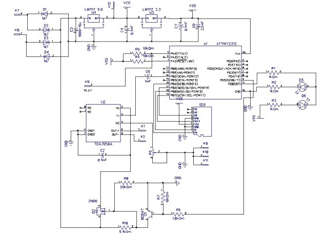 Собрал звонок, но был глюк в прошивке, сигнал включения усилителя появлялся сразу после включения питания. Прошивку доработал. Схему немного доработал ,добавил усилитель на TDA7056A и ключ на поливике для его включения. Схема и плата и прошивка ниже в архиве . Схема и плата нарисованы в DipTrace. Прошивку изменил немного, теперь усилитель включается по низкому уровню на 9 выводе. Резисторами R8 и R10 устанавливается напряжение питания усилителя, при текущих параметрах напряжение питания 7.5В. R8 можно совсем выкинуть , тогда напряжение питания усилителя будет такое какое с выхода выпрямителя. У меня после выпрямителя порядка 12В. При 7 вольтах питания усилителя достаточная громкость звучания. Не заработала прошивка с картой памяти фирмы SP (Silicon Power) 2 Гб, отлично работает с картами Transend и MicroSD и SD.