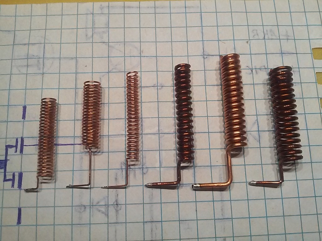 В поисках по интернету насобирал несколько разных параметров спиральных антенн для 433 МГц (всё что нашел), понаматывал их все и проверил каждую по волномеру, поочередно припаивая к передатчику. Из 6-ти спиралек только одна показала уровень сигнала как и от штыря 17 см. Эта антенна оказалась с сайта AliExpress (спасибо китайцам). На фото из 6-ти она первая слева. Вот только на дальность еще не успел проверить. Так же прикладываю фото с её параметрами с сайта али.