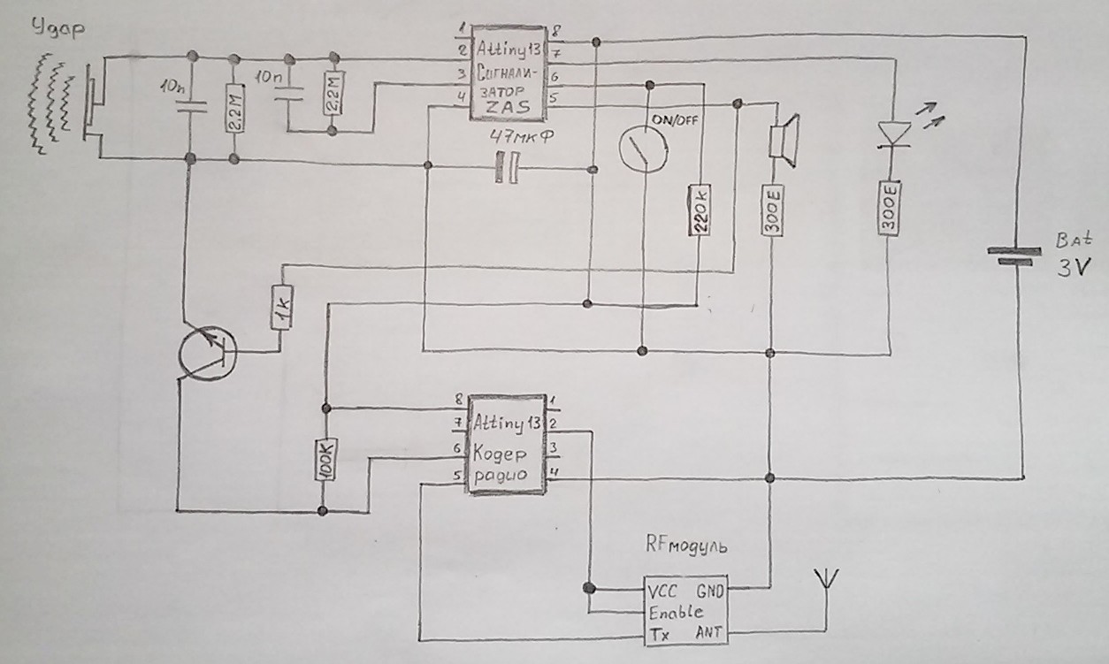 А теперь о потреблении тока всего этого безобразия. Тинька Сигн.2 в дежурном режиме потребляет 0,5 мкА (тут автор постарался) её можно сразу вешать на питание. Передатчик, за счет того, что он подключен к 2 ножки МК (Enable) - потребляет свои 15 мА только в момент передачи кода на пейджер т.е. при фиксации поклёвки, остальное время он выключен.