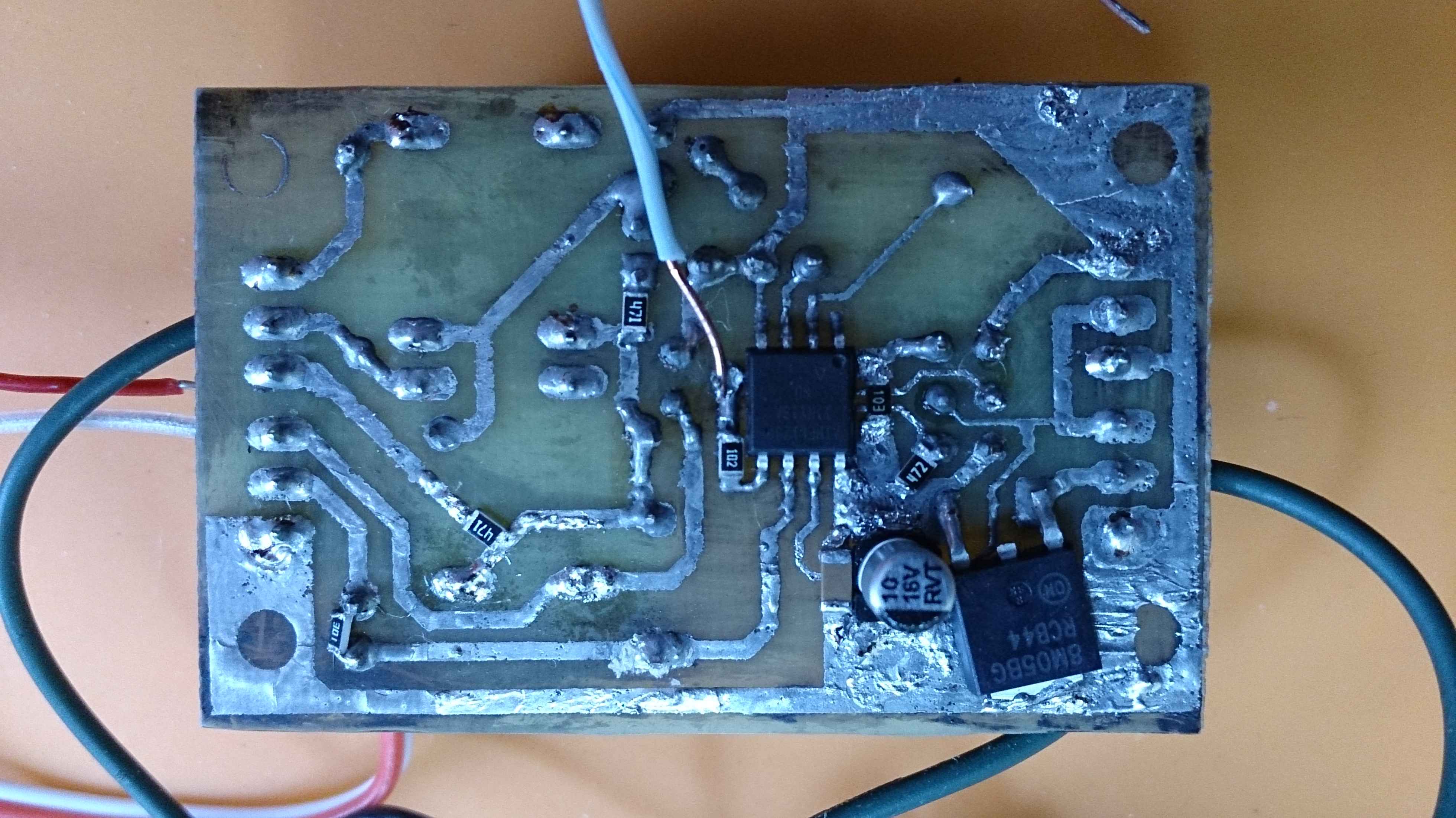 Вот что происходит: даю питание зумер начинает звенеть , а светодиод подключенный к соответсвующему выходу горит в полнакала, замыкаю кнопку, светодиод горит ярко и зумер начинает жужжать громче. Замкнул как сказали Вы. Зумер звенеть перестал и светодиод погас. Плату я почистил как вы говорили щеткой и ацетоном она теперь вся аж горит, и соплей вроде не осталось.