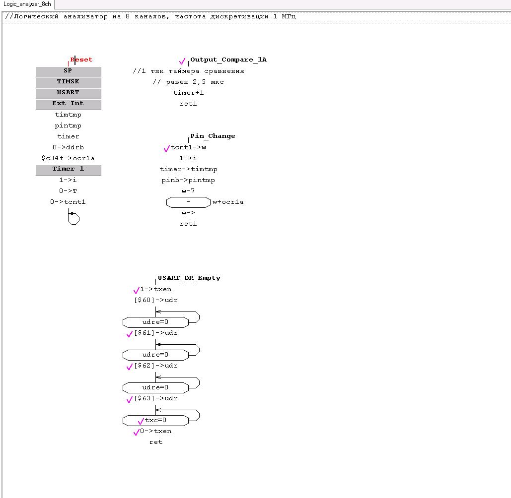 Вот припёрло мне отладить мою плату и прошивку, стал искать логические анализаторы в инете, что почём. И тут подумал, а почему бы не сваять свой собственный. В закромах валялось несколько МЕГ и ТИНЕК, выбрал тиньку 2313, т.к. максимальная частота больше. В итоге вот что удумал: частота максимальная 20МГц на кварце, порт В настроен на прерывания PIN CHANGE, таймер Timer1 с предделителем 1, тикает до 50000, затем сравнивается со значением OCR1A что равно 2,5 мкс. Алгоритм следующий: создаётся 4 байтная переменная и инкрементируется в прерывании таймера по сравнению. Это у нас счётчик, кратный 2,5 микросекундам. Значение счётчика таймера TCNT1 записывается в отдельную переменную. Это счётчик, кратный 50 нс. Далее, при появлении лог 0 или 1 на входах порта "В" срабатывает прерывание Pin_Change, в этом прерывании сохраняются значения регистра порта, значения счётчиков TCNT1 и 4 байтного. Получается переменная с указанием значения времени и логическими уровнями на входах порта. А дальше ещё не придумал) В плане создать массив в оперативке, куда будут скидываться данные, ну и алгоритм отправки массива по UART. В итоге планируется получить достаточно точный анализатор, фиксирующий до 1МГц на 8 каналах. Единственное нет софта для пк, который сможет выводить данные. Данные планируется передавать через UART на макс скорости контроллера. На этом реализован минимум функций. Где-то читал, что можно прикрутить библиотеки DLL Saleae Logic и использовать её.