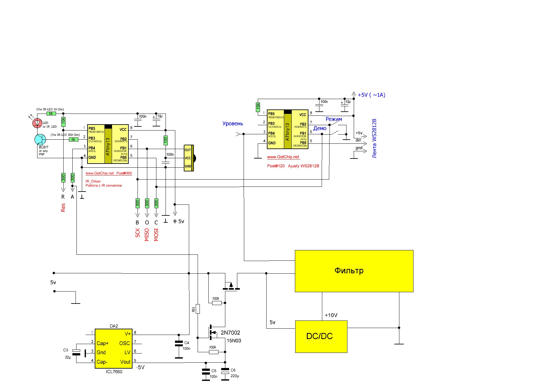 Теперь подаём питание на мк через диод и ставим кондёр 470мкФ у самого мк. Работа схемы стала непредсказуемой. Может включиться, может сама выключиться или среагировать на пульт с второго или третьего раза. В последствии вообще сбросила настройки пульта, пришлось заново обучать.