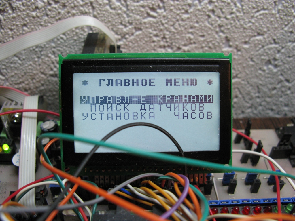 • Алгоритм поиска на шине датчиков DS18B20 (до 3_х датчиков) и привязка конкретного датчика по выбору пользователя к определённому каналу измерения ( 1. Холодная вода. 2. Горячая вода. 3. Управление вентилятором.). Данные о привязке датчиков сохраняются EEPROM.