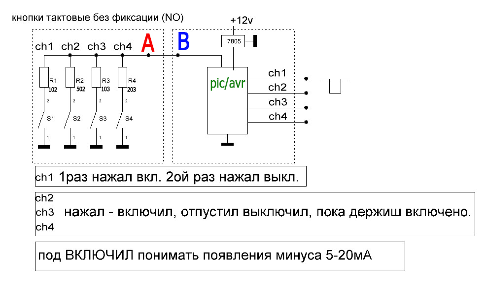 Добрый день. Нужно написать прошивку. Техническое задание в рисунке. По рисунку, часть что слева "А" уже есть что справа "В" надо сделать, блоки соединяются одним сигнальным проводом, длинной около 3м., и имеют общую массу. Номиналы резисторов возле кнопок не критичны можно изменять.