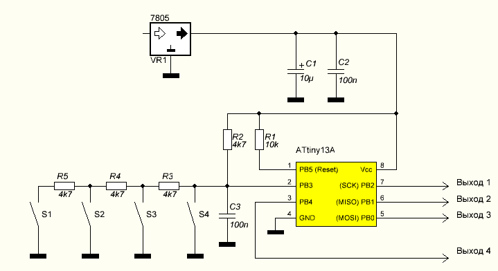 Вот, готово… пробуем и отписываем… расклад по схеме: используются кнопки S2, S3, S4. Которые соответствуют выходам – Выход 2, Выход 3 и Выход 4. Выход 1 и кнопка S1 - не используются. Соответственно R5 не ставится.
