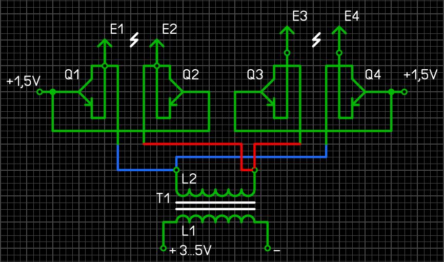 Доброго времени суток! Задался идеей, сделать так, что-бы можно было управлять/перенаправлять разряд с 2-й обмотки трансформатора на разные электроды. Иными словами, имеется схема электро стимулятора мышц, в основе которой стоит один повышающий трансформатор. На 1-ю обмотку трансформатора подается напряжение 5V. С 2-й обмотки трансформатора получаем краткосрочный разряд на два электрода. В данной ситуации, все работает/функционирует приемлемо. Один трансформатор, из 2-й обмотки которого выходят два провода на два электрода, на которые подается разряд. Но я хочу реализовать поддержку не двух, а сразу четырех электродов! Суть задачи состоит в том, что-бы по отдельности можно было задействовать 1-е два и 2-е два электрода отдельно друг от друга, т.е. подавая разряд на 1-е два электрода, 2-е два не должны реагировать и на оборот... Например, задействуем электроды расположенные с левой стороны, а электроды расположенные с правой стороны остается не задействованы и на оборот... Я пробовал использовать ключи на полевых/биполярных транзисторах в качестве переключателей, но из этого не чего не получилось. Исходящий ток все-равно идет на все четыре электрода. Пробовал использовать твердотельные реле "КР293КП1А", эффект был таким же... Возможно я что-то не учел, делал не правильно или неверно пытаюсь реализовать данную задачу... :bumbed: