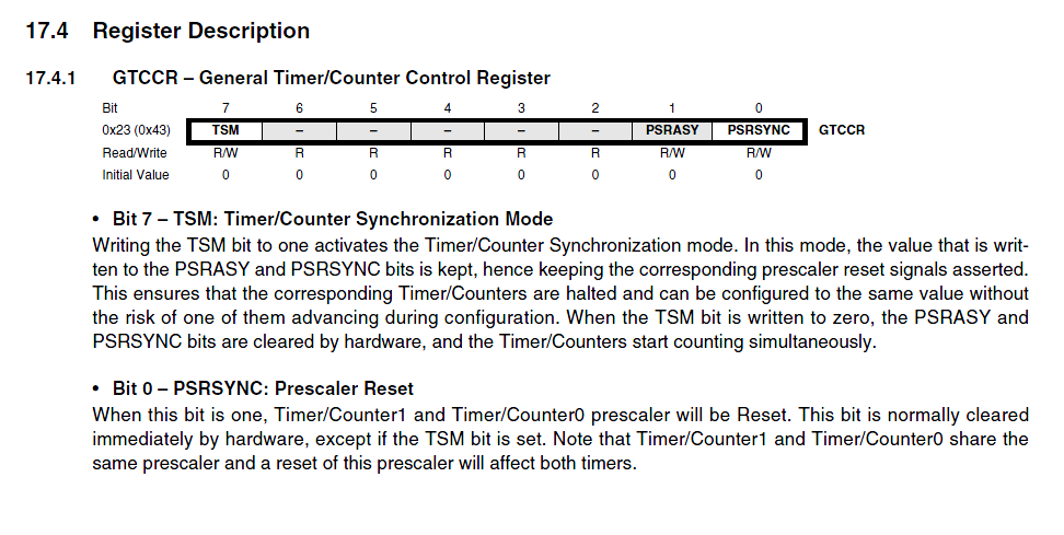 Можно ли как-то принудительно обнулять регистр прескалера таймера (любого)? Регистр сравнения OCR** обнуляется, допустим, при совпадении, но при этом счетный регистр прескалера сохраняет накопленное значение, а это вносит довольно заметную ошибку при измерении коротких временнЫх интервалов.