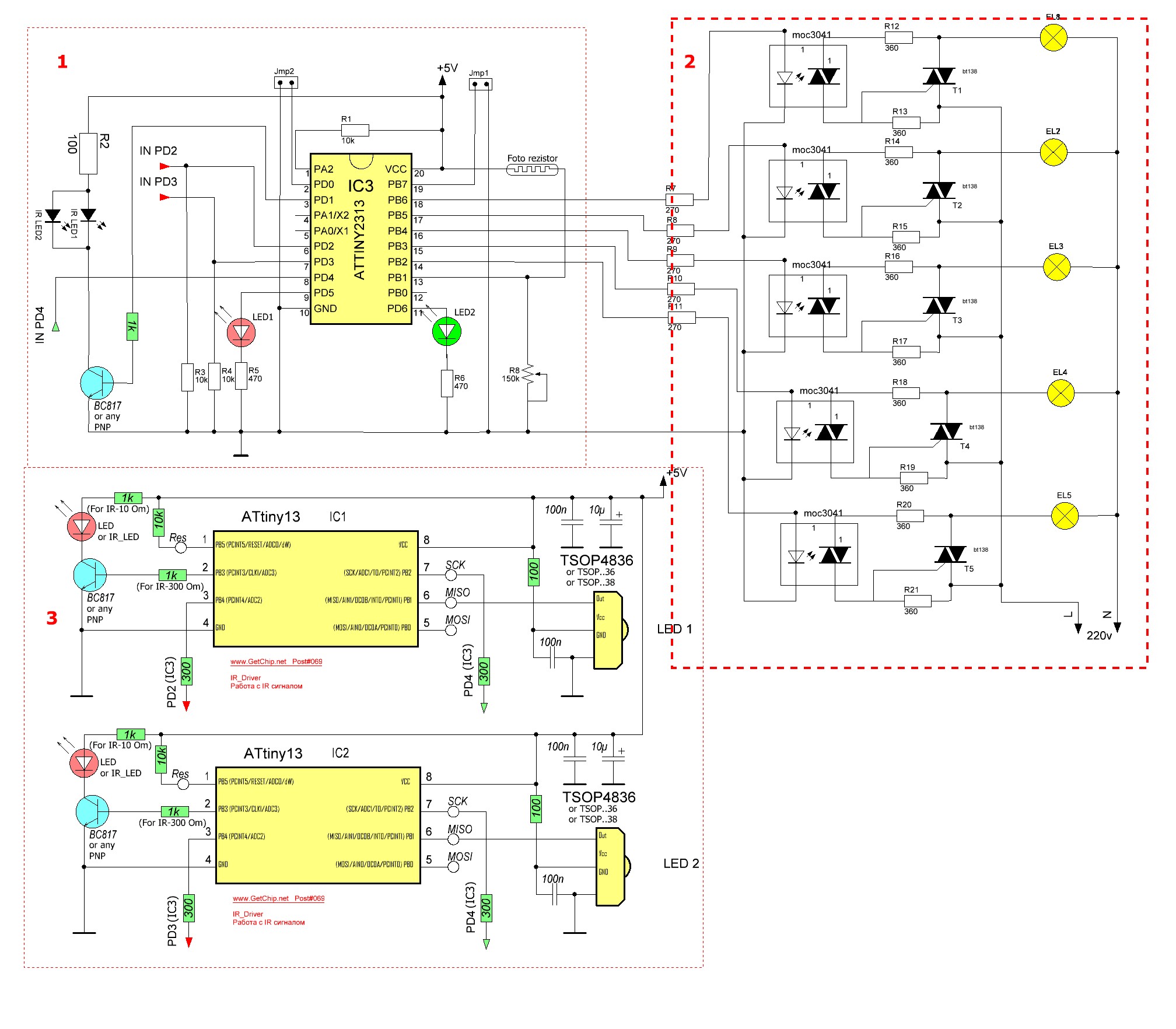 Данное устройство состоит из основной части управления освещением - (1), силовой - (2) , и два IR-приемника (3) на основе (IR Driver на ATtiny13) от GetChip.