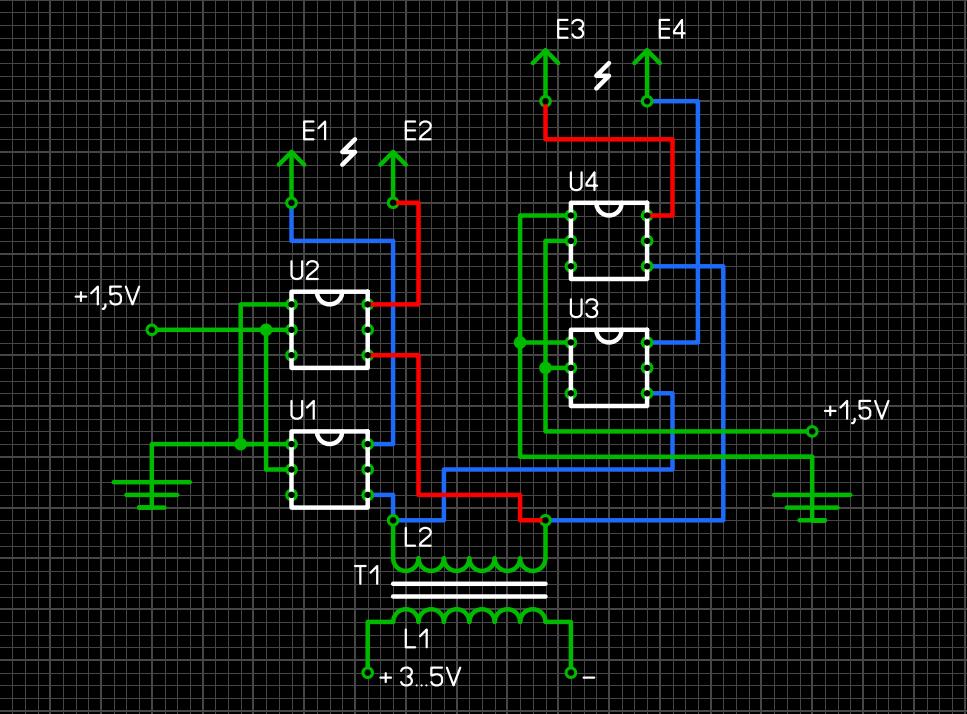 Доброго времени суток! Задался идеей, сделать так, что-бы можно было управлять/перенаправлять разряд с 2-й обмотки трансформатора на разные электроды. Иными словами, имеется схема электро стимулятора мышц, в основе которой стоит один повышающий трансформатор. На 1-ю обмотку трансформатора подается напряжение 5V. С 2-й обмотки трансформатора получаем краткосрочный разряд на два электрода. В данной ситуации, все работает/функционирует приемлемо. Один трансформатор, из 2-й обмотки которого выходят два провода на два электрода, на которые подается разряд. Но я хочу реализовать поддержку не двух, а сразу четырех электродов! Суть задачи состоит в том, что-бы по отдельности можно было задействовать 1-е два и 2-е два электрода отдельно друг от друга, т.е. подавая разряд на 1-е два электрода, 2-е два не должны реагировать и на оборот... Например, задействуем электроды расположенные с левой стороны, а электроды расположенные с правой стороны остается не задействованы и на оборот... Я пробовал использовать ключи на полевых/биполярных транзисторах в качестве переключателей, но из этого не чего не получилось. Исходящий ток все-равно идет на все четыре электрода. Пробовал использовать твердотельные реле "КР293КП1А", эффект был таким же... Возможно я что-то не учел, делал не правильно или неверно пытаюсь реализовать данную задачу... :bumbed: