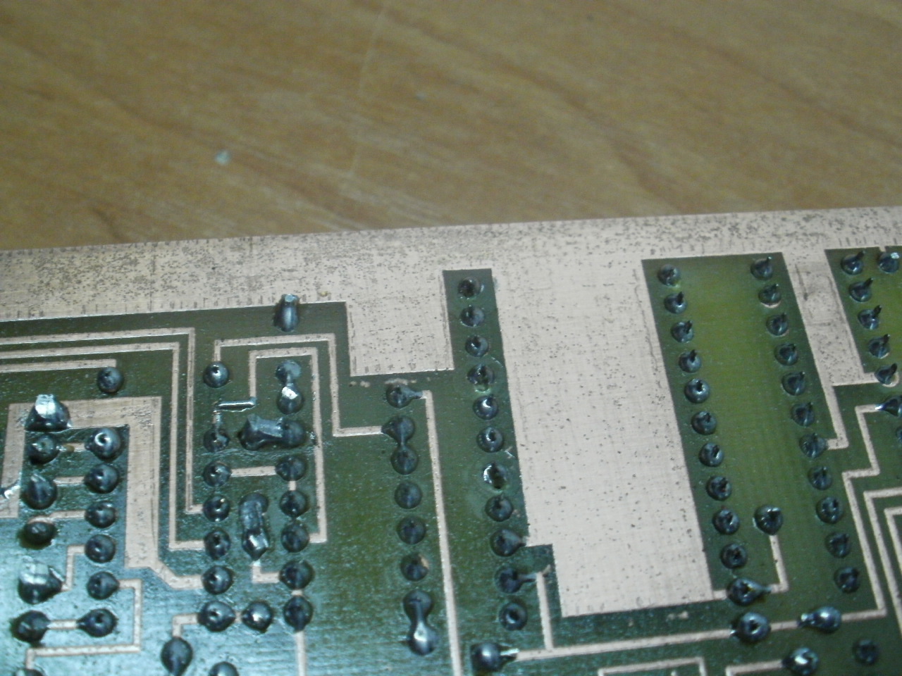 Плату сверлил и паял мой семилетний сын. Плату потом протер спиртом с канифолью. Непропай потому что панельки выпаивались газовой горелкой с плат , плата горела и поэтому налет на выводах черный только на кончиках , а ниже они луженные . Я всегда счищаю этот налет , но эта плата делалась просто ради интереса , уже у меня есть программатор «экстра пик». У меня есть станок для рисования печатных плат , полностью моя программа , моя разработка станка . Я его описывал раньше на форумах « станок для рисования печатных плат и выжигания лазером » , кому интересно погуглите , только вот не на всех форумах фотки остались . P2010055.JPG
