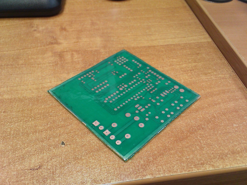 Фото печатной платы. Печатку делал фоторезистом, качество конечно получше чем ЛУТ, но должен быть качественный шаблон и фоторезист не пересветить, потренироваться пришлось. Покрыл плату пленочной паяльной маской, вроде не плохо получилось, хотя тоже не с первого раза.