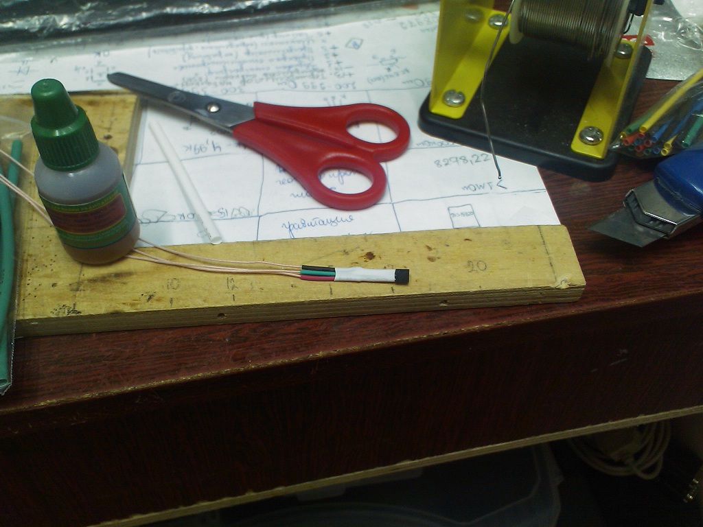 Датчик температуры для установки под пленку. Выводы сразу обозначил цветной термоусадкой, чтобы не перепутать при подключении.