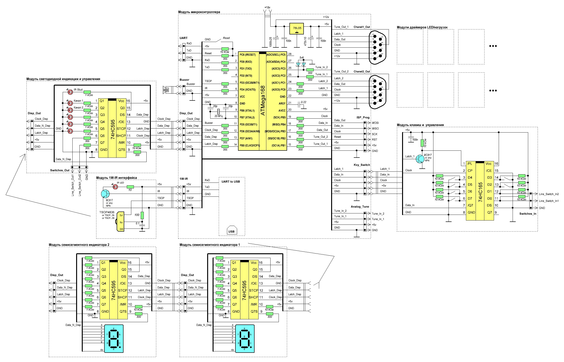 1 главного модуля (который содержит только микроконтроллер, стабилизатор 7805 и немного резисторов), который будет способен без ничего дополнительного выводить эффекты